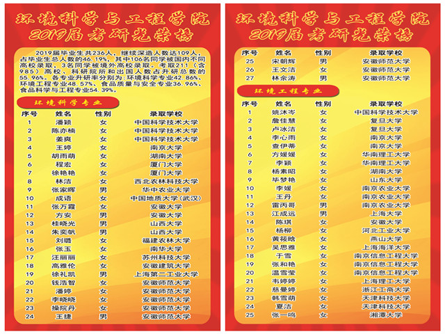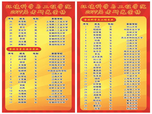 砥砺前行,续辉煌。2019届毕业生共236人,其中继续深造人数达到109人,占毕业人数的46.19%,其中106名同学被国内不同高校录取,3名同学被境外学校录取,考取211(985)高校、科研院所和出国人数占升研总数的55.96%。各专业升研率分别是为环境科学专业42.86%,环境工程专业48.57%。食品质量与安全专业36.96%,食品科学与工程专业54.39%。截止目前,学院2019届毕业生派遣就业率为82.63%,超过学校派遣就业率平均水平。