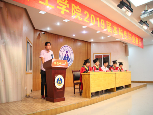 毕业典礼在庄严的国歌声中拉开序幕。周守标院长代表学院致辞,他充分肯定了2019届本科生在考研、就业等方面所取得的优异成绩,向辛勤培育学生成长成才的每位老师和家长表示衷心的感谢,并殷切希望同学们迈入社会后:做事要勤奋、遇人要热心、对人要尊重、为人要高尚。教师代表程新峰老师代表教师致辞,勉励毕业生要继续学习、不断学习,并向毕业生深情表达:母院永远是你们坚强的后盾,老师们会翘首以盼,等待大家载誉归来。