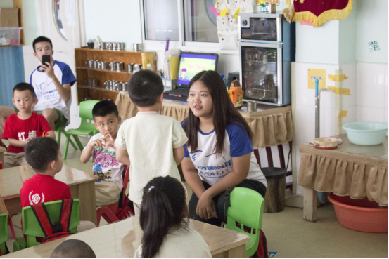 授课组四名队员两人一队,于幼儿园三楼的小班教室和中班教室进行环保宣教授课,授课主题为《保护土壤妈妈》。授课人黄蓉、余诗妙分别对小班30名学生和大班35名学生进行幼儿环保宣教。每个班参与授课活动的还有此幼儿园的两位正式授课老师,旁听授课过程。授课内容分为土壤基本知识讲解、“水土流失”科学小实验、互动小游戏三个部分。两位授课人结合PPT向幼儿园小朋友讲解什么是土壤,让他们认识土壤的作用和重要性。接着,通过科学实验让学生进一步了解“为什么植物能防止水土流失”,实验均成功完成。授课活动最后一项,是互动游戏环节,游戏名称为“萝卜蹲”,大部分学生积极参与游戏,与授课老师一起进行游戏。