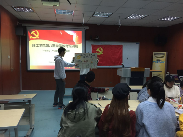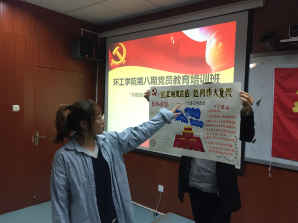 (环工学院分党校 文/图 王庆磊)11月9日,环工学院第八期党员教育培训班在行政楼一楼会议室组织开展“不忘初心,牢记使命”主题手抄报比赛活动,学员分为四组,合作完成一份手抄报,并现场分享手抄报的构思和中心思想。