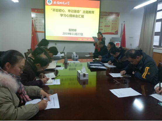 会上,昝树婷结合自身在“不忘初心、牢记使命”主题教育中的学习体会向支部党员进行了汇报。随后,她传达了学校《关于开展立德树人根本任务“大学习、大讨论、大落实”活动的通知》文件精神,她强调,要把开展立德树人根本任务“大学习、大讨论、大落实”活动作为“不忘初心、牢记使命”主题教育的重要内容,通过“大学习”“大讨论”“大落实”等多种形式,深入学习贯彻习近平总书记关于教育的重要论述,深入贯彻落实党的十九届四中全会、全国高校思想政治工作会议、全国教育大会和学校思想政治理论课教师座谈会精神,全面贯彻党的教育方针,扎实落实立德树人根本任务,努力培养德智体美劳全面发展的社会主义建设者和接班人。