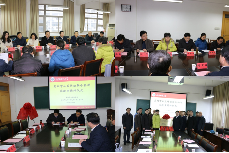 12月18日,芜湖市公益诉讼联合检测实验室在安徽师范大学环境科学与工程学院揭牌设立。芜湖市人民检察院党组书记、检察长何宏海,芜湖市人民检察院副检察长奚要武,芜湖市弋江区人民检察院党组书记、检察长马卫,芜湖市人民检察院第五检察部主任徐垒,芜湖市人民检察院第五检察部助理检察官熊秋萍,芜湖市经济开发区人民检察院第二检察部主任盛亮,芜湖市弋江区人民检察院第二检察部主任刘振球,芜湖市镜湖区人民检察院第五检察部主任汤恒明,芜湖市鸠江区人民检察院第二检察部主任范颖,芜湖县人民检察院第二检察部主任彭永彪;安徽师范大学副校长彭凤莲,安徽师范大学环境科学与工程学院党委书记王峰、院长周守标、党委副书记杨友谊、副院长甘为民、副院长杨如意,安徽师达环保科技有限公司法人杨文斌、总经理段文松参加了揭牌仪式。仪式由周守标主持。