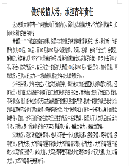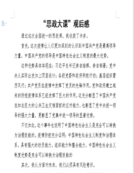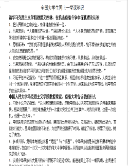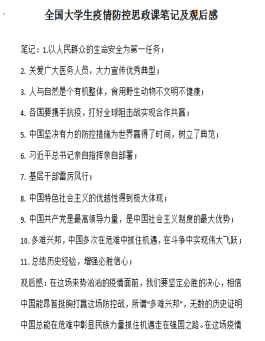 在这特殊的时期,即使是疫情也无法阻挡大家学习,全国大学生同上一堂疫情防控思政大课让教授化身“主播”为学生们进行线上教学,方式新颖,深受大家的欢迎。通过这次学习,同学们认为党对这次疫情的领导对我们防控疫情起到了关键性的作用。在党中央的集中统一领导部署下,全国上下众志成城、顽强拼搏,全国人民为打赢这场疫情防控阻击战积极配合,在各个领域贡献自己的力量。作为在防控疫情大后方的大学生,我们虽不能像医护人员那样奋战在抗疫一线,但能在这期间照顾好自己的身体,武装自己的头脑,理智对待谣言、居家不出,这是作为一个普通人力所能及的事情为祖国加油。