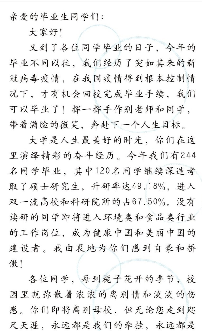 “说”—成长·对话,谈大学生活。2020届毕业生通过线上“成长·对话”平台组织了考研经验交流、就业经验分享、我的大学时光等五个模块20余场“空中报告会”,为低年级同学树立榜样,答疑解惑,充分诠释学院“全员育人”的理念。一封“家书”,纸短情长。学院院长周守标写下《致2020届毕业生的一封“家书”》,告诉毕业生们学院永远是大家坚实后盾、温暖家园和精神港湾,勉励大家保持一颗善良之心、一个进取之心、一个平常之心。深入宿舍,不舍师生情。毕业生返校短短5天,学院领导老师多次深入宿舍,“工作目前还满意吗?”、“以后科研打算朝哪个方向发展?”一句句问候倾注着学院领导老师对同学们的关心。2016级环境科学专业的叶紫琳激动地说道:“来到学院四年里最大的感受就是无论碰到大事小事老师们总在自己身边。”