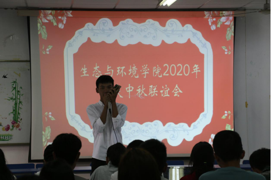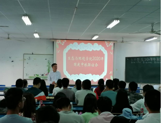 本网讯(生环学院 屈亚舒)为欢庆国庆中秋双节,给不能回家的同学营造节日氛围,增强同学们的归属感,学院于10月1日上午在实验楼201教室举行2020年国庆中秋师生联谊会。学院党委书记张伟、党委副书记杨友谊、辅导员郑合庆、屈亚舒、留校本科生、研究生参加联欢会。