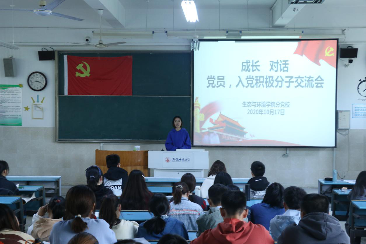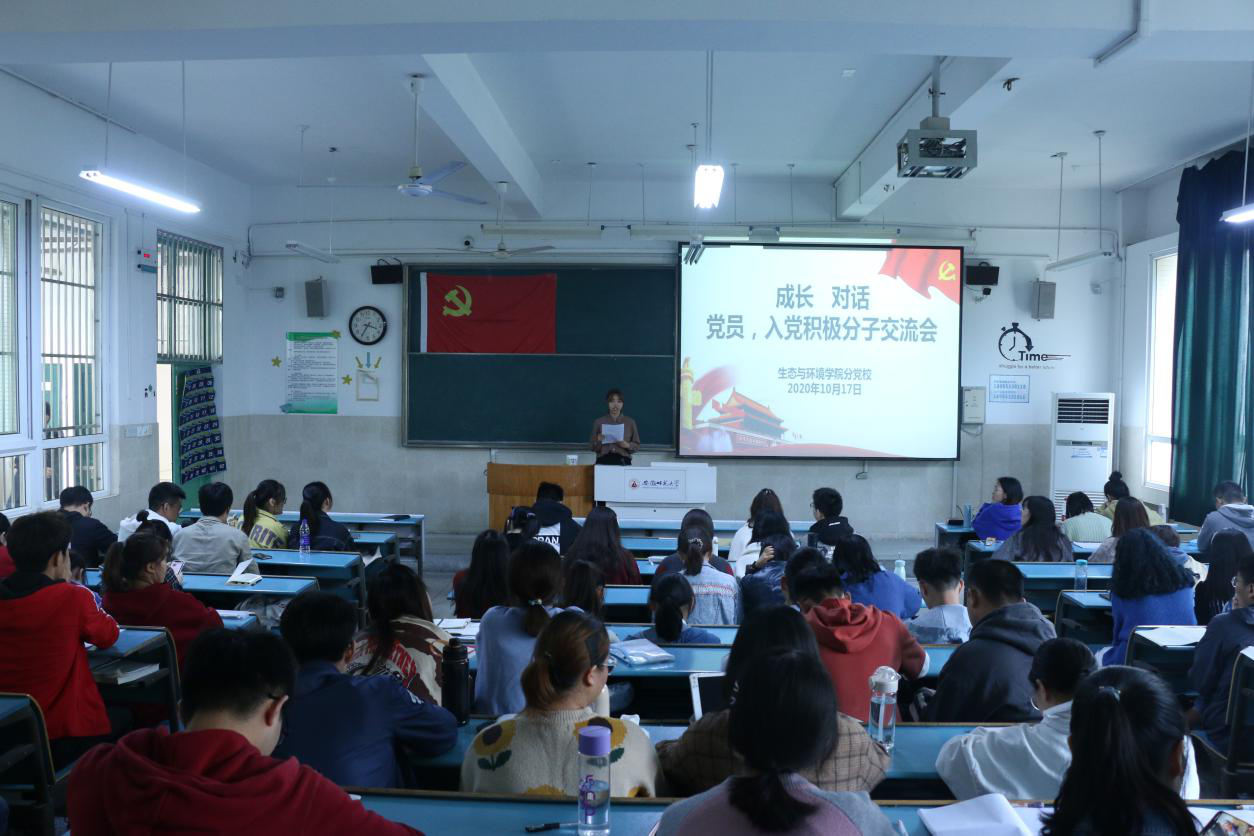 本网讯(生环学院分党校) 10月21日下午15:30,以“成长·对话”为主题的交流会在行知楼2010309教室顺利召开。生环学院分党校第1期入党积极分子培训班的70学员以及第1期党员教育培训班的16名党员同志参加此次交流会。本次会议由分党校班主任郑合庆主持。