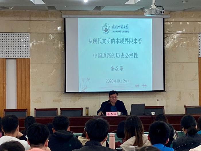 讲座伊始,余在海先从为什么要解读“中国道路”的问题入手,强调大学生党员的第一要务是认真学习,通过学习深刻理解马克思主义,理解中国道路。之后,余在海从中国道路问题的缘起及其解决方法、现代文明的本质及其界限和基本结论三个方面解读中国道路。在近两个小时的讲座中,余在海教授用翔实的案例,深入浅出地讲解了如何用马克思主义历史的、批判的世界观与方法论来研究中国的未来向何处去的问题,中国如何成功地走出一条不同于西方的现代化道路。