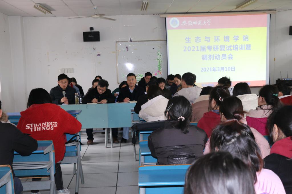 本网讯(生环学院 陈庆)2021年全国高校研究生复试工作即将开始,为进一步做好2021届考研学生的指导服务工作,3月10日下午,金沙城js9线路检测中心在实验楼201教室召开研究生复试培训暨调剂动员会。院领导胡好远、昝逢宇,学院严云志教授,研究生学院招生办公室凌从祥老师,各专业负责人、专业教师代表与80余名考研学生参加了培训会,会议由严云志主持。