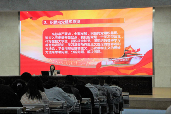 杨友谊围绕“中国共产党是什么?、青年大学生为什么要加入中国共产党?、怎样加入中国共产党?”3个问题展开报告。向同学们讲述了中国共产党的性质、指导思想和奋斗目标。随着第二个百年奋斗目标征程的推进,党和国家比任何时候都需要优秀青年大学生加入党组织,杨友谊从国家需要、个人发展等角度出发,鼓励同学积极向党组织靠拢。随后,介绍了入党申请书的书写格式和内容。希望同学们在今后的思想、学习、工作和生活中,用党员的标准严格要求自己,树立宗旨意识,充分发挥先锋模范带头作用。