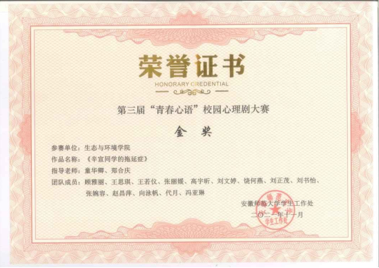 本网讯(院学生会 综合部)为进一步推进大学生心理健康教育工作,营造校园心理健康文化氛围,引领学生关注自我成长,增强学生心理维护意识,提升学生心理健康水平。11月20日下午,安徽师范大学第三届“青春心语”校园心理剧汇演在大学生活动中心二楼团委多功能厅举办,生环学院作品《辛萱同学的拖延症》荣获大赛金奖。