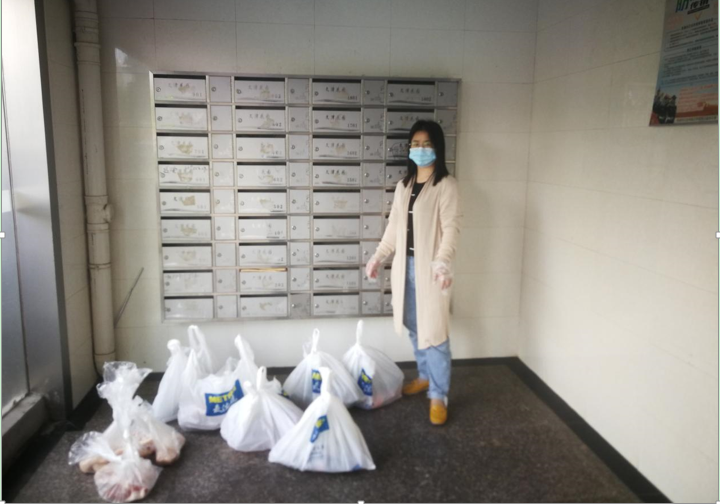 实验中心教师党员潘玲同志,积极加入社区志愿者队伍,为文津花园小区居民采购发放生活物资。