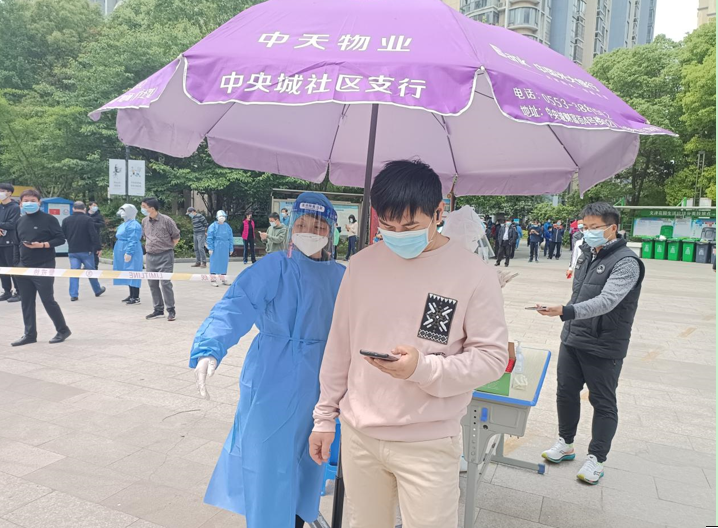 环境专业教师党员刘辉同志,参加滨江社区伟星金域华府小区核酸采样志愿服务。