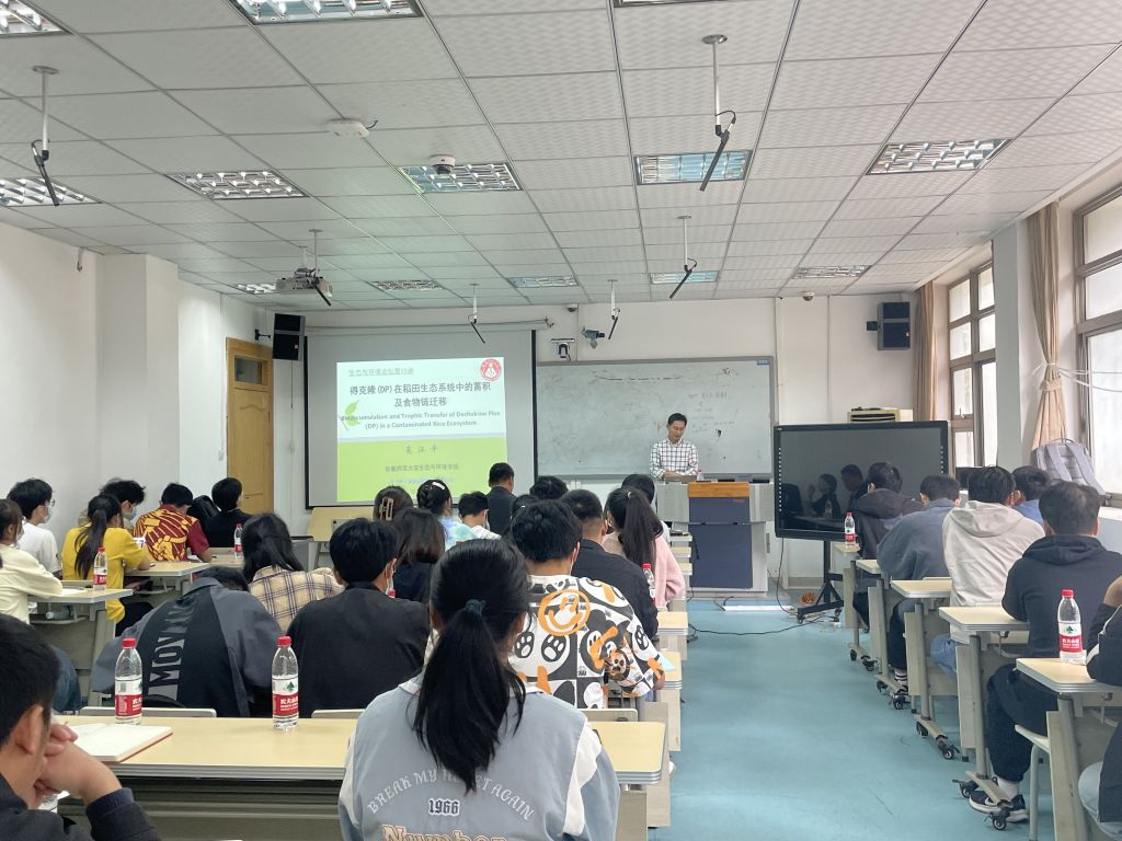 吴江平主要向同学们介绍了阻燃剂得克隆(DP)在稻田生态系统的蓄积及食物链迁移。首先,吴教授从得克隆是什么、有什么特点讲起,让同学们对得克隆有了基本了解。接着,吴江平着重讲解了他对得克隆在稻田生态系统的蓄积及食物链迁移过程的研究思路和实践过程。吴教授先从稻田土壤中DP的含量与组成以及DP在水稻中的蓄积及分布入手进行研究,再从DP沿土壤-水稻-福寿螺食物链迁移以及沿昆虫-蛙-蛇食物链迁移的过程进行探索。报告的最后,吴江平分享了他在研究中总结的结论与经验。
