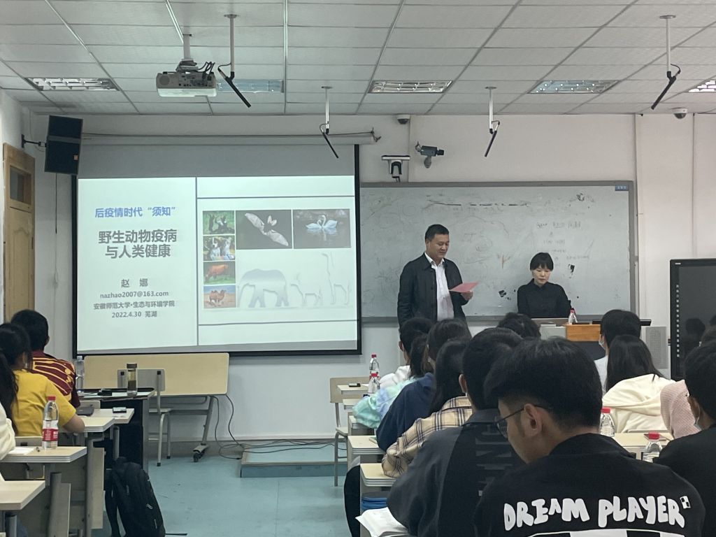 赵娜以“后疫情时代须知”为题,让同学们了解了野生动物疫病与人类健康的关系。报告开始,赵娜首先以野生动物疫病的定义、特点为引,介绍了蝙蝠传染病、蚊媒传染病、蜱传疾病、鸟传疾病等传染病,进而叙述了野生动物与人类重大传染疾病的关系,向我们科普了一些新现的传染病。接着,她通过一些例子,指出了野生动物在传染病的产生及传播中扮演的角色——“天然储藏宿主”、“移动传染源”。接下来,赵娜从防控理念、防控理论、防控策略、防控措施、防控实践等五个方面,详细讲解了如何防控野生动物疫情。最后,赵娜紧跟时事,详细地向同学们讲解了新冠病毒,同时强调了防疫中国速度。赵娜以“一代人有一代人的长征,过好疫情常态化下的校园生活就是我们的长征”为寄语,鼓励同学们积极乐观地面对疫情,遵守学校管理规定,好好学习,提升自己。