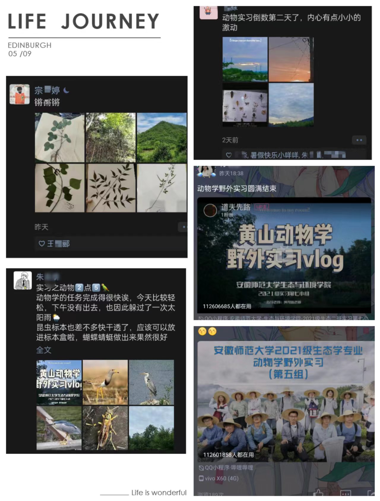 兴趣引导,提升能力。为了提高学生的专业学习兴趣,指导教师改变了教学方法,从过去重视采集标本的种类数改变为重在掌握研究方法和提高学习兴趣。实习过程中,老师在指导采集和观测标本的同时,以给予过程考核分的方式鼓励学生拍摄图片,制作影像资料,引导利用朋友圈、公众号等新媒体平台进行科普宣传。数以千计的图片、影像资料从不同方面、不同时空记录了实习过程和心得,各小组至少制作发布了一个记录视频,不仅记录了同学们的珍贵回忆,也有利于加强大众对生态学和生物多样性知识的了解。各实习小组在组长的协调安排下,合理安排成员分工,各成员全员参与各环节,整个实习过程井然有序,忙而不乱。
