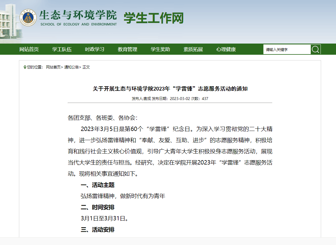 为深入学习贯彻党的二十大精神,进一步弘扬雷锋精神和“奉献、友爱、互助、进步”的志愿服务精神,积极培育和践行社会主义核心价值观,引导广大青年大学生积极投身志愿服务活动,展现当代大学生的责任与担当。生环学院响应学校号召,分层次、分年级开展“弘扬雷锋精神,做新时代有为青年”为主题的学雷锋志愿服务活动。