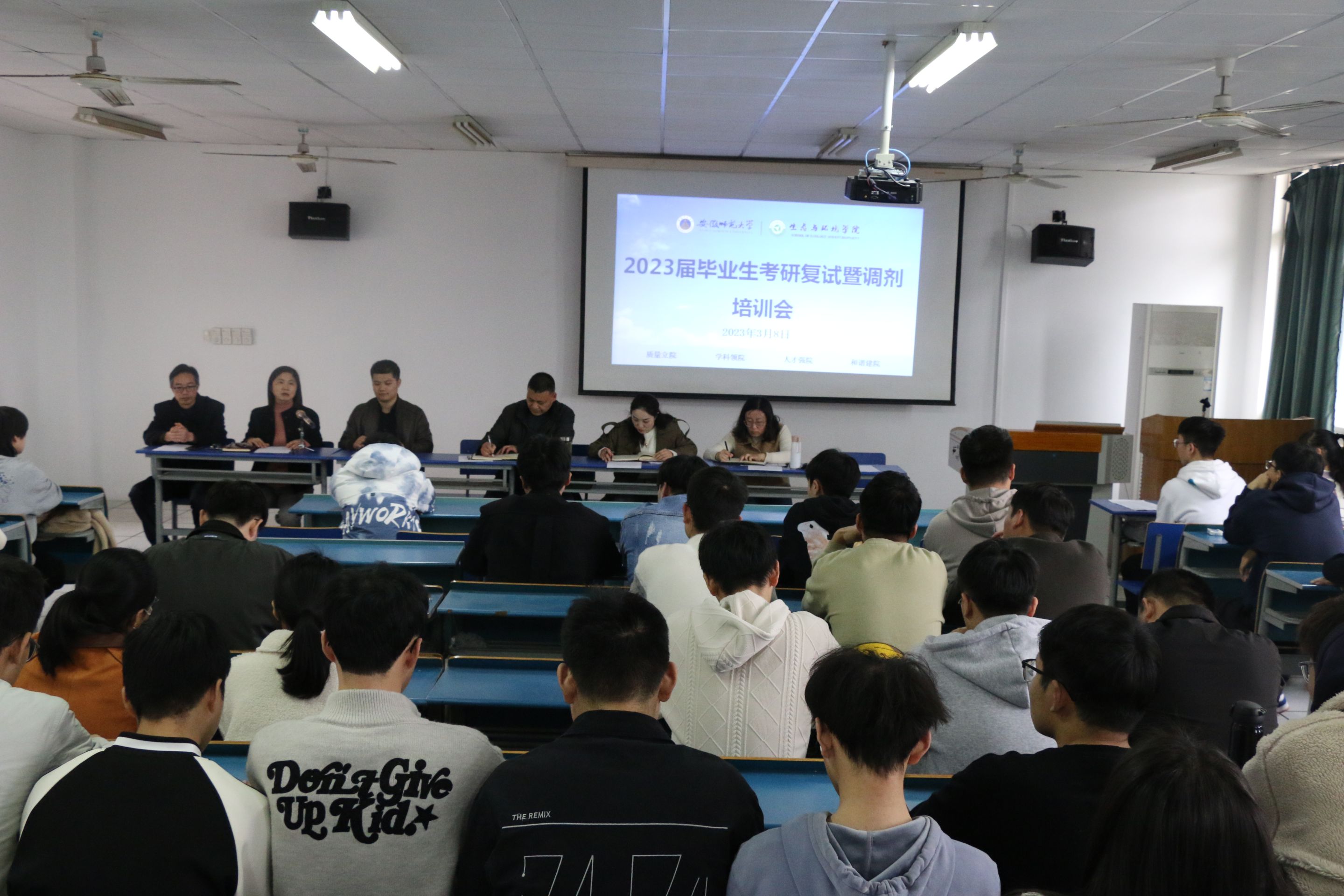 为进一步做好2023届考研学生的指导服务工作,3月8日下午,学院在实验楼201教室召开研究生复试培训暨调剂动员会。院长胡好远、院党委副书记杨友谊、副院长昝逢宇,专业负责人项贤领、刘畅、研究生学院招生办公室张崇、辅导员郑合庆及70余名考研学生参加了培训会,会议由杨友谊主持。