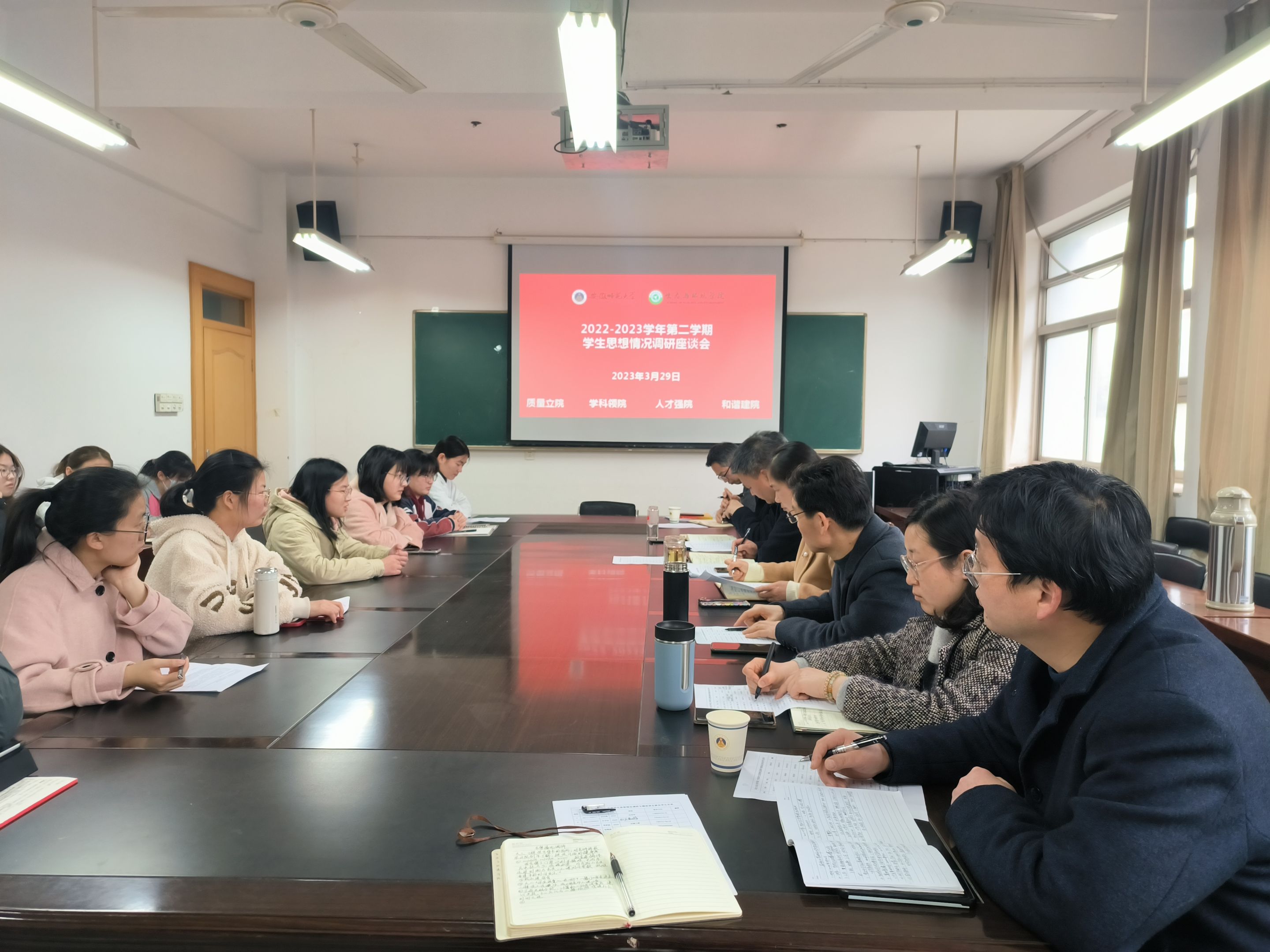 3月29日下午在学院行政楼3楼会议室,学院组织召开本学期学生思想情况调研专题座谈会,院长胡好远、党委副书记杨友谊、教学副院长严云志、生态学拔尖班专业负责人温新利、生态学专业负责人项贤领、环境工程专业负责人陶海升、环境科学专业负责人刘畅、辅导员王梓和各班级学生代表参加会议。会议由杨友谊主持。
