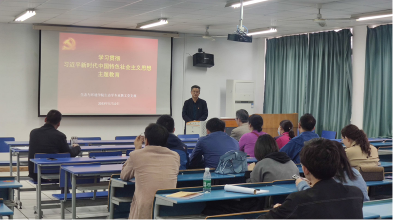 5月10日下午,生态学专业教工党支部在实验楼201教室开展了学习贯彻习近平新时代中国特色社会主义思想主题教育专题党课和学习研讨。院长胡好远、副院长严云志及支部全体党员参加了专题活动,活动由党支部书记项贤领主持。