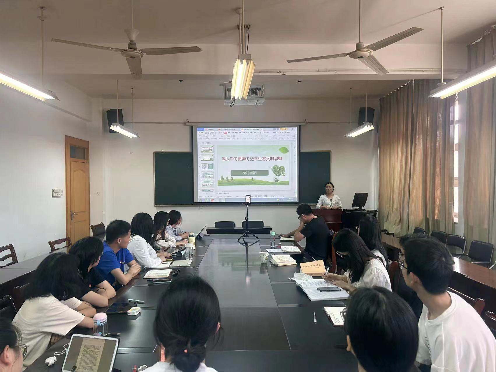 研讨环节,李佳莉、吴进成同志就深入学习贯彻习近平生态文明思想作分享交流,指出习近平生态文明思想是马克思主义中国化的原创性理论成果,是建设美丽中国的强大思想武器,是实现人与自然和谐共生的现代化的根本遵循。作为环境科学专业的学生,要立足专业、砥砺创新、知行合一、理实并举,为祖国的生态文明建设添砖加瓦,共同建设美丽中国。