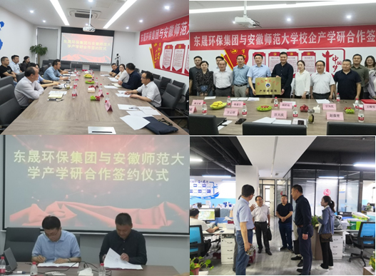 在东晟环保科技集团(安徽)股份有限公司,公司副董事长汪大庆、副总裁兼环境咨询中心总经理方云祥、副总裁刘晓猛、副总刘军、总工程师赵葆青和学院毕业生伍红亮、杨刚、张晓、杨亮亮、石晓菁、何玉环等参加了会议。汪大庆介绍公司基本情况和环境咨询、环境检测、环境工程和环保设备四大业务板块等一站式环境服务体系方面取得的成果。胡好远从人才培养、科学研究、学科团队等方面介绍了学院的基本情况,尤其是生态学高峰学科和省部共建协同创新中心等学科平台建设情况。昝逢宇介绍了学院学位点情况和研究生联合培养情况。胡好远和汪大庆代表双方签订了产学研合作协议并授牌。随后,胡好远一行参观了东晟环保科技集团实验室。