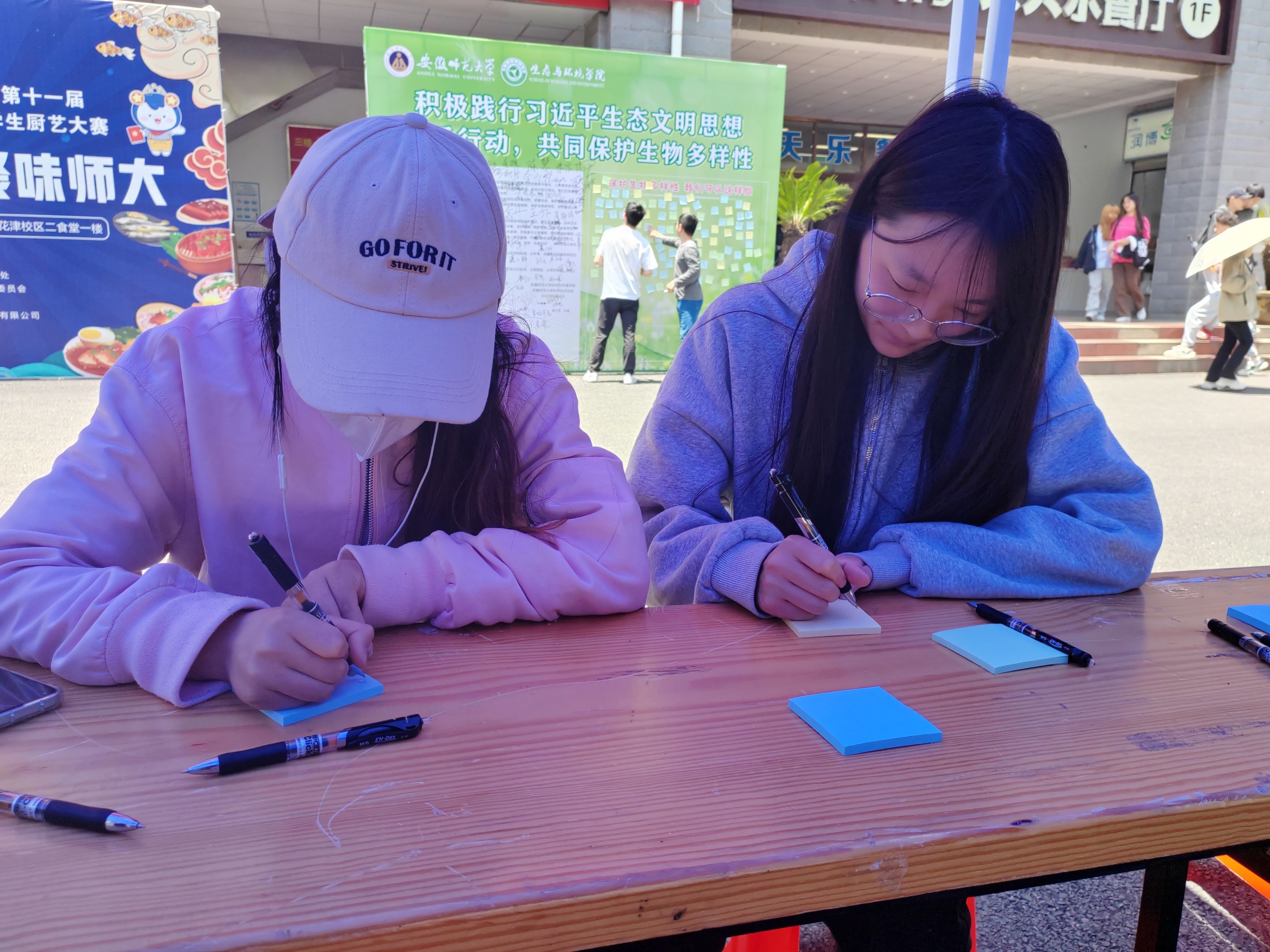 活动现场,师生们踊跃参加,通过浏览科普知识展板和研究生党员志愿者的讲解,认真学习了解习近平生态文明思想的主要内容,保护生物多样性的意义与举措,安徽省重点保护野生动植物、生物多样性保护优秀案例等内容,充分认识到保护生物多样性以及生态文明建设的重要性。师生们纷纷签名积极响应倡议内容,并结合实际写下躬行实践的承诺宣言,为保护生物多样性、建设美丽中国许下自己的承诺,领取象征希望和生命力的多肉植物作为纪念,种下一颗颗人与自然和谐共生的绿色种子。