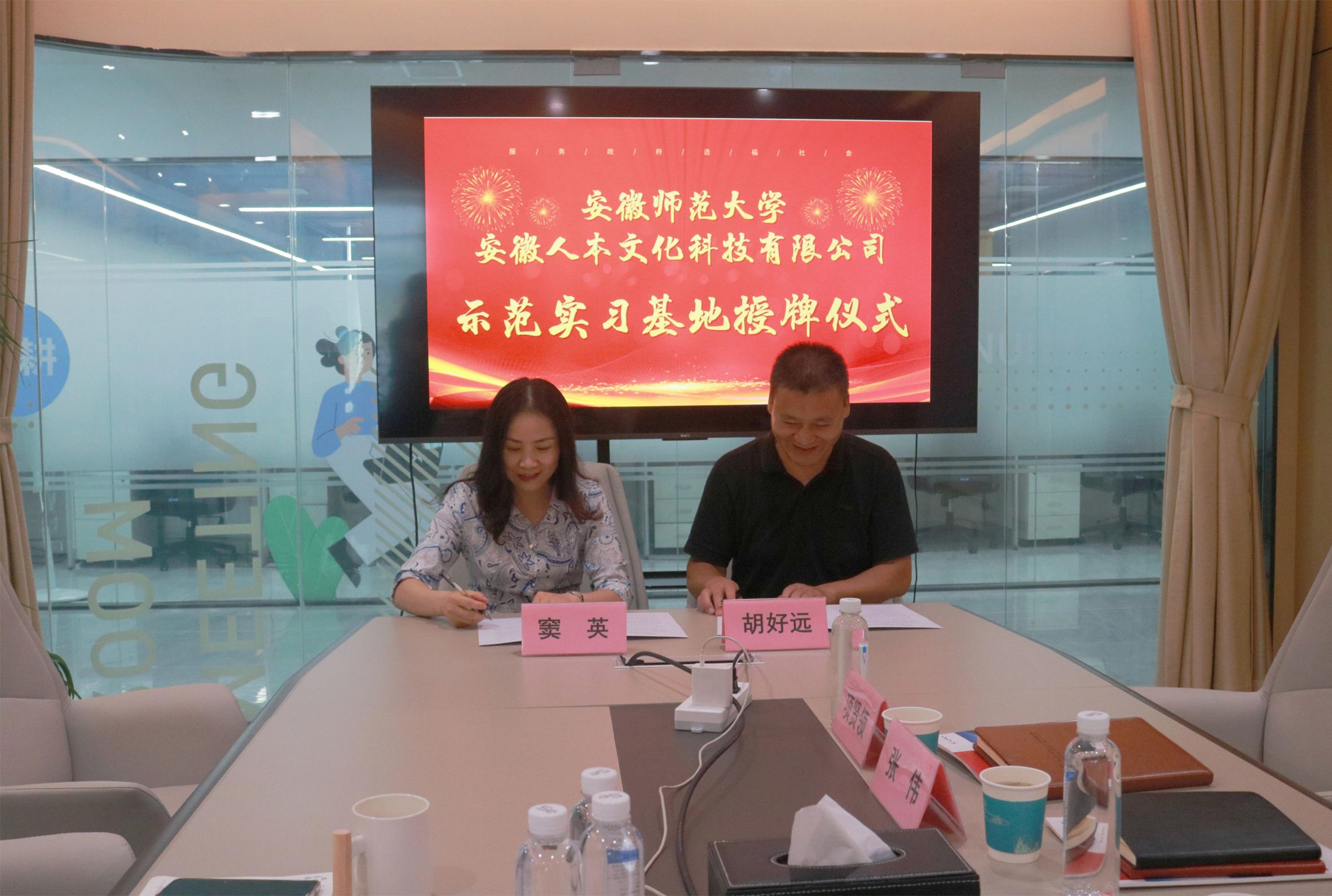 安徽人本文化科技有限公司总经理窦英、策划部经理文雅晴、市场部经理王好、人力资源部经理熊正芳等参加本次合作交流。窦英对学院一行到访表示欢迎,对学校、学院的办学水平以及目前在公司实习的学生给予了充分肯定;她详细介绍了公司的企业文化、业务范围、发展历程情况,希望双方深化合作,实现互利共赢。胡好远从人才培养、科学研究、学科团队等方面介绍了学院的基本情况,希望在学生实习实训、毕业生就业、项目联合申报、行业标准制定等方面开展深层次的合作。张伟强调双方要加强沟通交流,在人才培养、毕业生实习与就业、项目申报等方面开展实质化合作,真正实现优势互补、互惠共赢。双方签订了就业实习基地共建合作协议,举行了实习就业基地授牌仪式。随后,学院一行参观了公司各部门的工作室。
