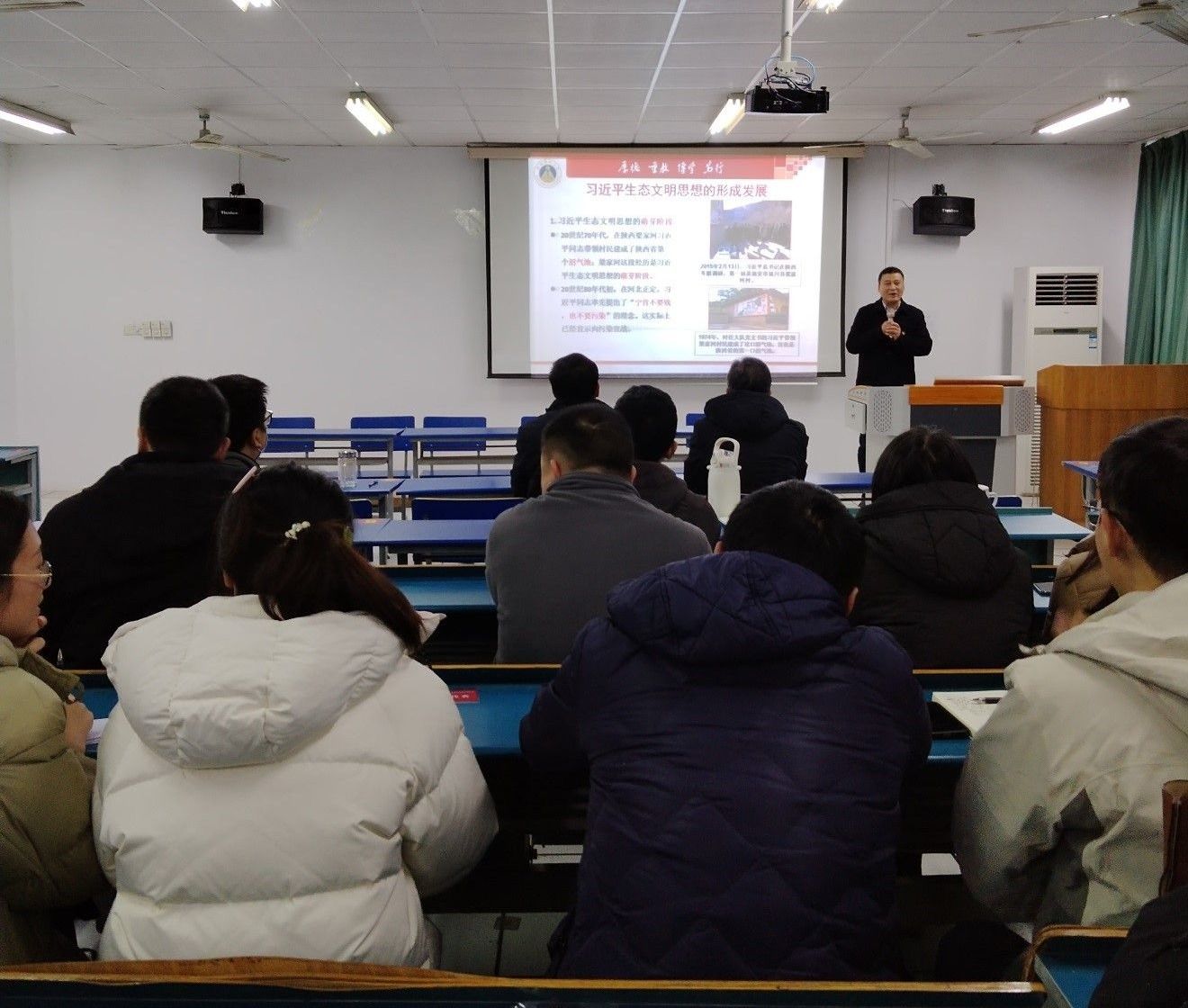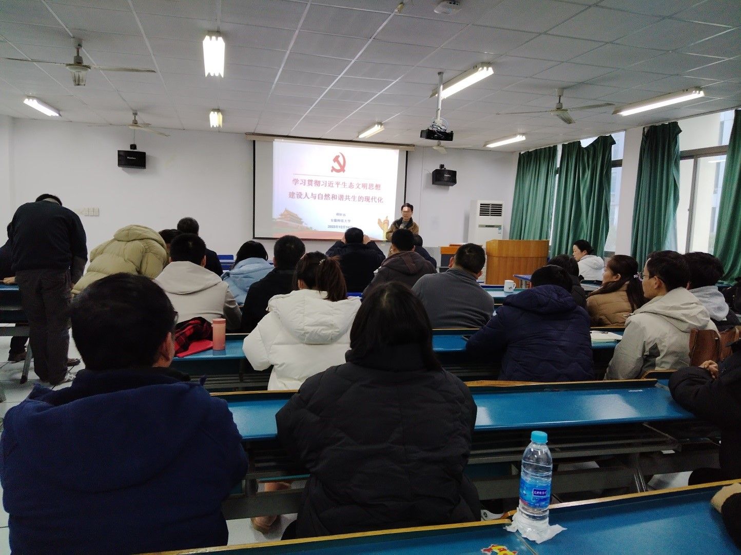12月14日下午,环境专业教工党支部与生态学专业教工党支部在学院实验楼201教室联合召开支部大会,邀请学院院长胡好远作题为《学习贯彻习近平生态文明思想,建设人与自然和谐共生的现代化》的专题党课。支部全体党员参加了会议,会议由环境专业教工支部书记陶海升主持。