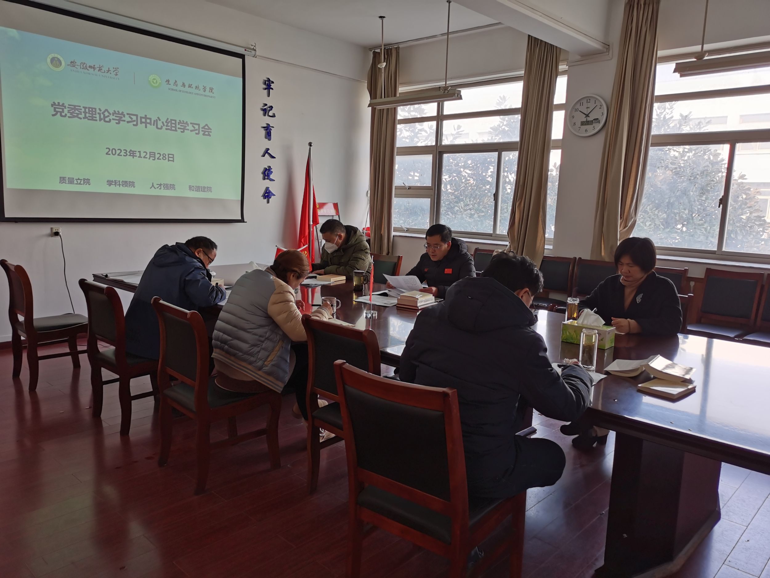 会上,与会人员集体观看学习了《中共中央举行纪念毛泽东同志诞辰130周年座谈会 习近平发表重要讲话 》《正确理解和领会习近平经济思想》《每日一习话·坚持发扬斗争精神》新闻视频。张伟领学了中共中央宣传部、中共中央组织部印发《关于进一步提高党委(党组)理论学习中心组学习质量的意见》的通知精神,重温了习近平总书记考察安徽重要讲话指示精神、省第十一次党代会精神;院长胡好远领学了《习近平著作选读第一卷》“深刻认识做好新形势下统战工作的重大意义”篇章内容和习近平总书记关于加强和改进人民信访工作的重要论述,解读了《安徽师范大学信访工作实施办法》;副院长严云志领学了《习近平法治思想学习纲要》“十一个坚持”、《习近平新时代中国特色社会主义思想学习纲要》“高质量发展”、《习近平谈治国理政》第四卷“贯彻总体国家安全观,构建大安全格局”等篇章内容。